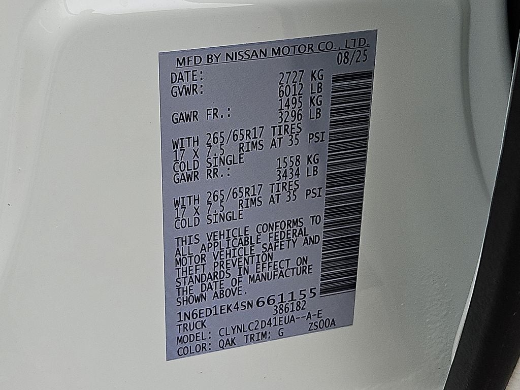 The vehicle comes equipped with Android Auto for seamless smartphone integration on the road. The Nissan Frontier features a hands-free Bluetooth® phone system. See what's behind you with the back up camera on the vehicle. The Nissan Frontier's Lane Departure Warning helps keep you in your lane. Apple CarPlay: Seamless smartphone integration for this Nissan Frontier - stay connected and entertained on the go! The rear parking assist technology on this vehicle will put you at ease when reversing. The system alerts you as you get closer to an obstruction. This small pickup shines with clean polished lines coated with an elegant white finish. The vehicle has a V6, 3.8L high output engine. It has four wheel drive capabilities. This model has an automatic transmission. This 2025 Nissan Frontier features cruise control for long trips. Electronic Stability Control is one of many advanced safety features on the vehicle. The vehicle is equipped with a gasoline engine.