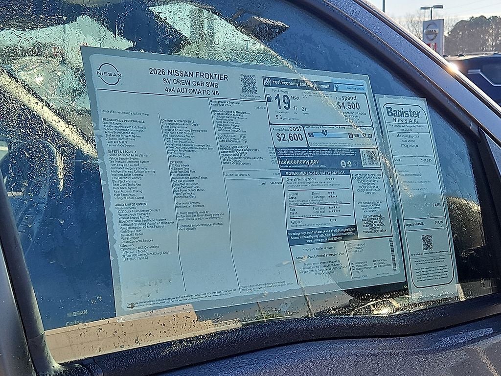 See what's behind you with the back up camera on the vehicle. The vehicle offers Android Auto for seamless smartphone integration. Apple CarPlay: Seamless smartphone integration for this vehicle - stay connected and entertained on the go! This small pickup's Lane Departure Warning helps keep you in your lane. Bluetooth® technology is built into this 2026 Nissan Frontier , keeping your hands on the steering wheel and your focus on the road. The rear parking assist technology on this Nissan Frontier will put you at ease when reversing. The system alerts you as you get closer to an obstruction. When you encounter slick or muddy roads, you can engage the four wheel drive on this small pickup and drive with confidence. This small pickup has a V6, 3.8L high output engine. The vehicle projects refinement with a racy metallic gray exterior. Enjoy the tried and true gasoline engine in this model.