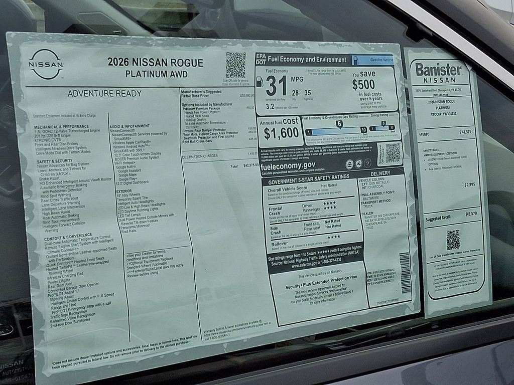 Experience premium driving with this 2026 Nissan Rogue Platinum AWD, now available in Chesapeake, VA — priced to sell and offering the best value in the area. Powered by an efficient 3-cylinder, 1.5L gasoline engine and advanced all-wheel drive, this Nissan Rogue balances spirited performance with excellent fuel economy for city commutes and coastal road trips. Step inside to a refined interior featuring genuine leather seats and a BOSE stereo system that delivers immersive sound for every drive. Stay seamlessly connected with Apple CarPlay and a built-in navigation system that guides you confidently to your destination. Safety and convenience are prioritized with a crisp back-up camera and driver-assist technologies that make parking and lane changes effortless. This Platinum trim showcases premium finishes, thoughtful tech, and comfortable seating for every passenger. The compact yet capable design of the Nissan Rogue delivers nimble handling, while AWD adds traction and stability in variable weather conditions around Chesapeake and beyond. With a competitive price that outshines comparable listings nearby, this Nissan Rogue Platinum represents exceptional value without compromising luxury or features. Schedule a test drive in Chesapeake, VA today and experience the blend of technology, comfort, and efficiency this 2026 Nissan Rogue Platinum AWD offers. Don't miss out on the best priced Nissan Rogue in the market — it won't last long.