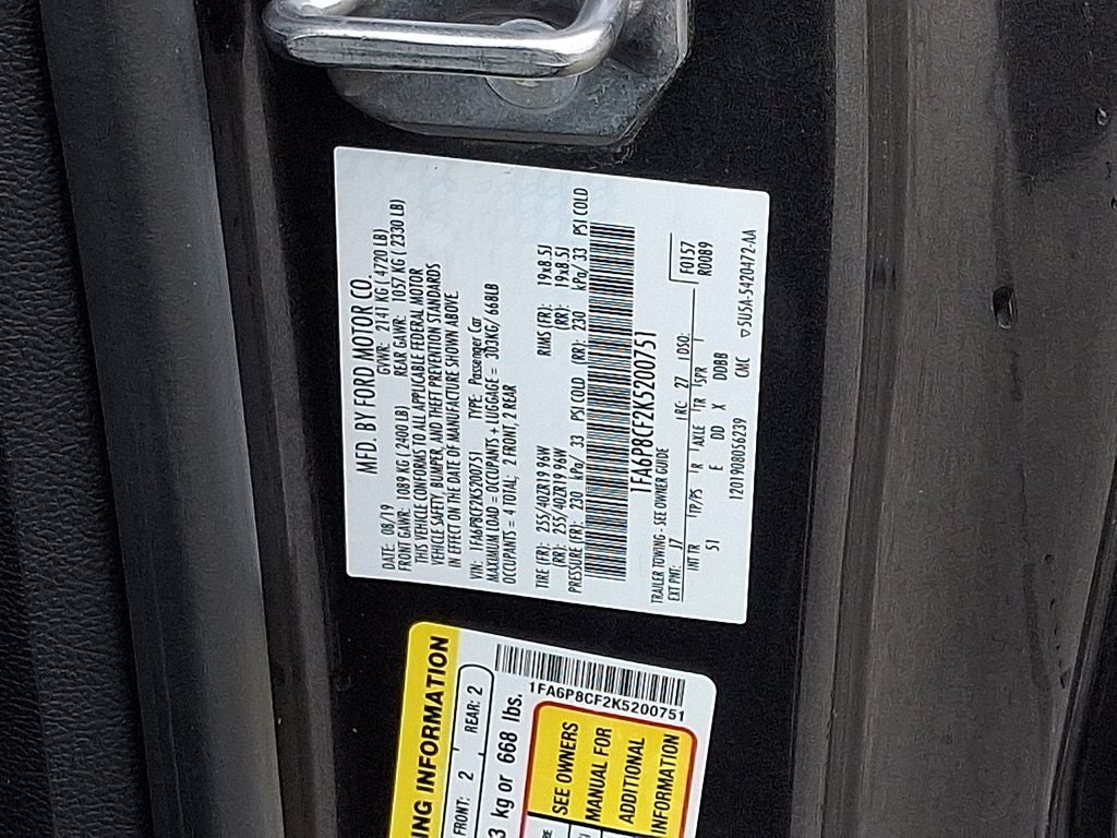 Equipment Group 401A: 18" X 8" Machined-Face Aluminum Wheels; Blind Spot Info System with Cross-Traffic Alert; Leather Bucket Seats with Color Accents; 5.0L Ti-VCT V8 Engine; 6-Speed Manual Transmission; 235/50ZR18 BSW AS Tires; AM/FM Stereo; Memory Driver Seat. Mirrors and Ambient Lighting. Premium Plus Package: 12" LCD Digital Instrument Cluster with MyColor; Voice-Activated Touch-Screen Navigation System; Heated Steering Wheel; FordPass Connect. Black Accent Package: Black Rear Spoiler; Black GT. 5.0 and Pony Badges. Premier Trim with Color Accent Group: Linked Graphite Aluminum Instrument Panel; Premium Floor Mats with Accent Stitch. Voice-Activated Touch-Screen Navigation System. 3.55 TORSEN Limited Slip Rear-Axle. **Equipment listed is based on original vehicle build and subject to change. Please confirm the accuracy of the included equipment by calling the dealer prior to purchase.**